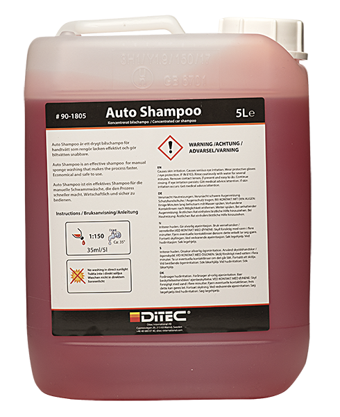 Ditec Auto Shampoo er en skånsom og effektiv bilsjampo som rengjør bilen grundig uten å skade lakken. Den er spesielt utviklet for å fjerne smuss, trafikkfilm og andre forurensninger, samtidig som den bevarer voks- eller lakkforseglingen. Med sitt milde, men effektive skum gir Ditec Auto Shampoo en ren og glansfull overflate etter hver vask. Bruk kun 25 ml per 10 liter vann for å oppnå optimale resultater. Egenskaper: • Effektiv rengjøring: Fjerner smuss og trafikkfilm uten å skade lakken. • Skånsom formel: Bevarer eksisterende voks og lakkforsegling. • Mildt skum: Gir en jevn fordeling og enkel skylling. Fordeler: • Ren og skinnende bil: Etterlater en glansfull overflate etter hver vask. • Bevarer beskyttelsen: Skånsom mot bilens eksisterende beskyttelse, slik at du kan vaske oftere uten bekymring. • Økonomisk i bruk: Kun 25 ml per 10 liter vann gir effektiv rengjøring. Bruksanvisning: 1. Skyll bilen med vann for å fjerne løst smuss. 2. Bland 25 ml Ditec Auto Shampoo med 10 liter vann. 3. Bruk en svamp eller vaskehanske for å vaske bilen fra topp til bunn. 4. Skyll grundig med rent vann og tørk med en mikrofiberklut.