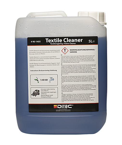 Lavskummende innvendig rengjøring, av tepper og stoffseter. Kan også brukes på skinn. Bruksanvisning: 1. Fyll en sprayflaske med middels varm vann. Bland inn ca 2-4 dl med Textil Cleaner. 2. Spray på direkte og vask med skurekost, svamp eller microfille. Er det ekstra skittent, spray på flere ganger og børst med skurekost. Pass på at stoffet ikke får skader. 3. Ha rent middels varmt vatn i rensemaskin og spray på med rent vatn. Sug opp alt vann og kjemi som er brukt. Spray på flere ganger med rent vann og sug opp all kjemi som kommer. Det er viktig å få bort all såpe. Tørk over alle plastdetaljer som er i området rundt for å hindre at rester av rensemiddelet på sikt lager merker i plasten. Bruk godt med vann. 4. Når rensejobben er avsluttet, settes det ovner i bilen til den blir tørr. Åpne vinduene litt slik at fuktigheten får trekke ut. 5. La bilen stå over natten.